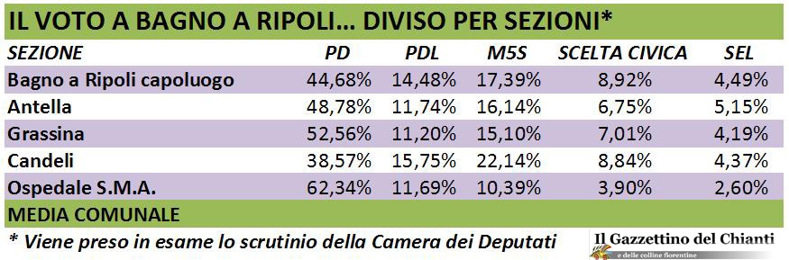 Non riserva sorprese l'analisi dei voti alla Camera dei Deputati, suddivisi per sezioni nei seggi di Bagno a Ripoli (CLICCA NELL'IMMAGINE PICCOLA PER INGRANDIRE LA TABELLA). Senza prendere in considerazione il seggio dell'ospedale Santa Maria Annunziata, il Partito democratico conferma la forza maggiore nelle sezioni grassinesi, dove ottiene una media superiore al 52%.