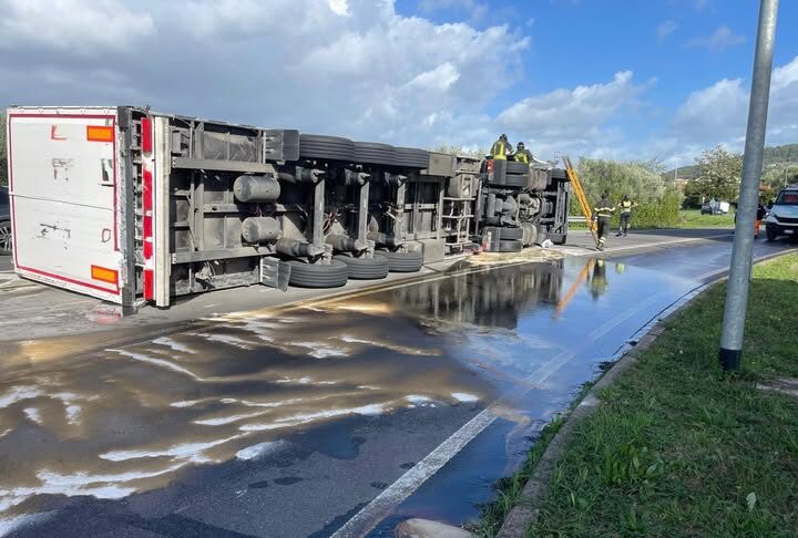 Il mezzo dovrà essere svuotato per poter essere rialzato e si sta provvedendo alla bonifica della carreggiata in seguito allo sversamento di gasolio.