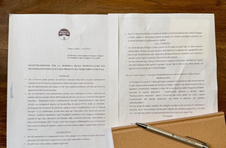 E chiedono, quindi, nella mozione, “di introdurre nella denominazione di ogni singola scuola presente nel comune di Bagno a Ripoli una caratterizzazione che ne identifichi l’orientamento insegnato e voluto dal corpo docente e dalla dirigenza scolastica, inserendo le seguenti descrizioni: “politicamente schierata a sinistra” oppure “ideologicamente comunista”, oppure “favorevole alle teorie lgbtq+ e/o woke”, oppure “antiamericana, anti sionista, antifascista, anti libertà di pensiero, anti cattolica, antidemocratica”. Ciò allo scopo di rendere possibile alle famiglie con figli in età scolastica di individuare e scegliere, tra gli istituti scolastici fornite delle suddette denominazioni aggiuntive, i più adatti per l’orientamento politico/sociale/sessuale/culturale/religioso dei propri figli”.