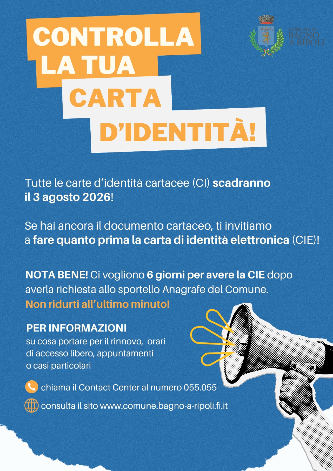 Anche per i cittadini di Bagno a Ripoli, a partire dal 3 agosto 2026 la carta d’identità cartacea non sarà più valida e dovrà essere sostituita con la carta d’identità elettronica (CIE).