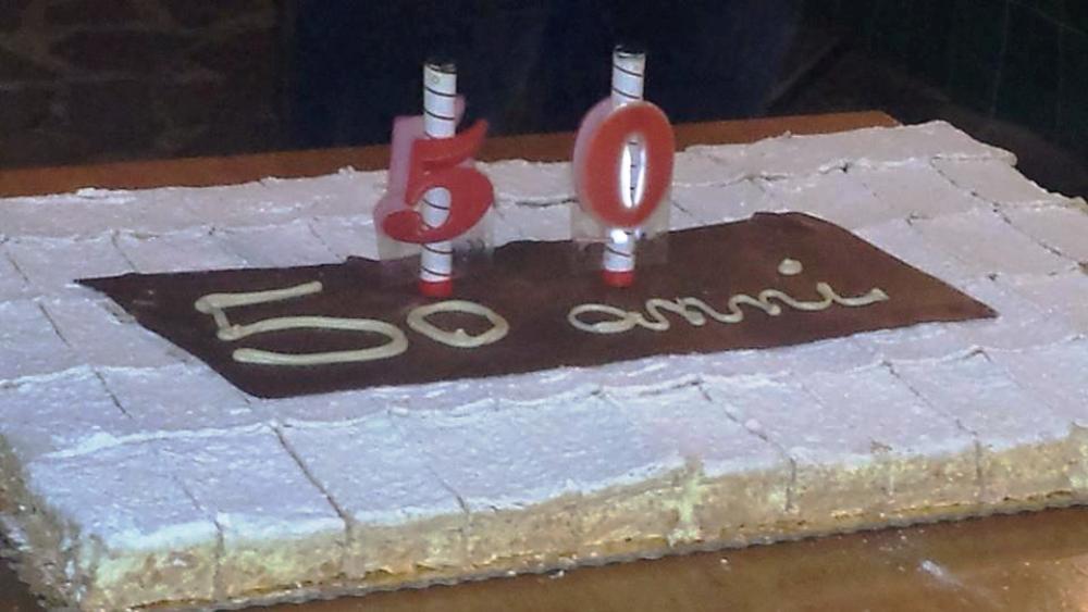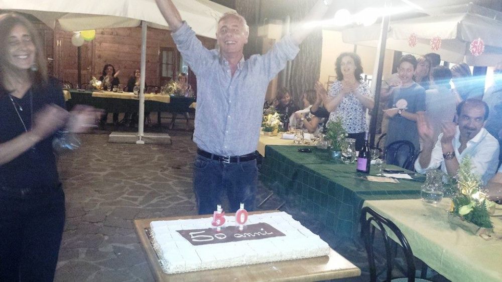 La location nel giardino della casa del popolo, con un menù di tutto rispetto: antipasti, due primi, due secondi, un millefoglie con le candele e il leitmotiv della serata “50 anni”.
