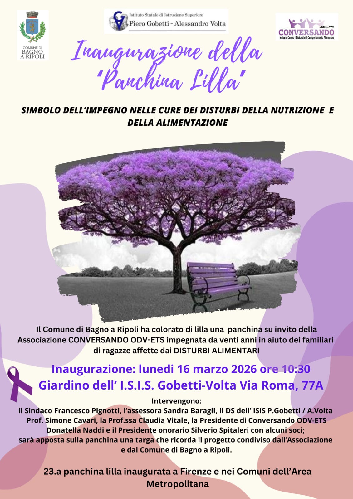 “Con questa inaugurazione si aggiunge un nuovo simbolo di impegno nel territorio: quella di Bagno a Ripoli sarà infatti la ventitreesima panchina lilla inaugurata a Firenze e nei Comuni dell’area metropolitana”, spiegano dall’associazione Conversando.