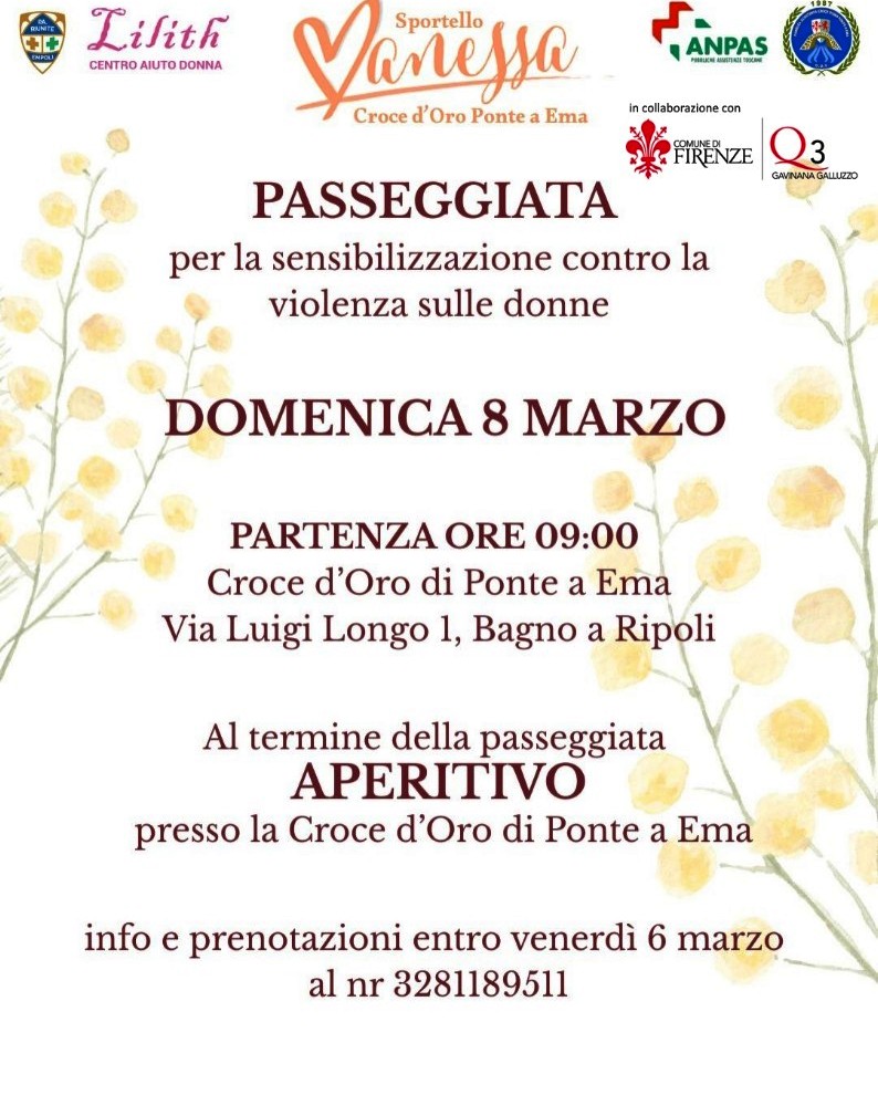 BAGNO A RIPOLI – In cammino, contro la violenza sulle donne. È l’iniziativa promossa dalla Croce d’oro di Ponte a Ema in occasione della Giornata internazionale della donna.