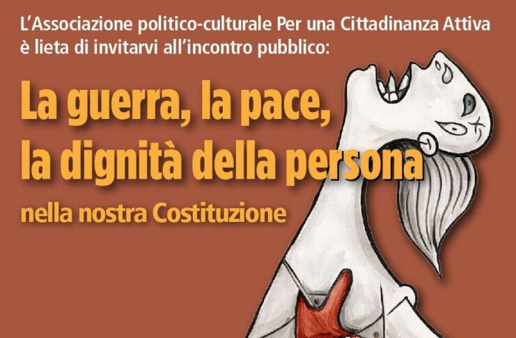 BAGNO A RIPOLI – “La guerra, la pace, la dignità della persona nella nostra Costituzione”: incontro pubblico, promosso da Per Una Cittadinanza Attiva, in programma per martedì 28 aprile, alle ore 21.15, presso il Teatro Comunale di Antella.