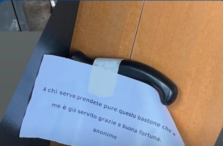 Questo il messaggio, scritto su un foglietto attaccato al bastone: “A chi serve prendete pure questo bastone che a me è già servito. Grazie e buona fortuna. Anonimo“.