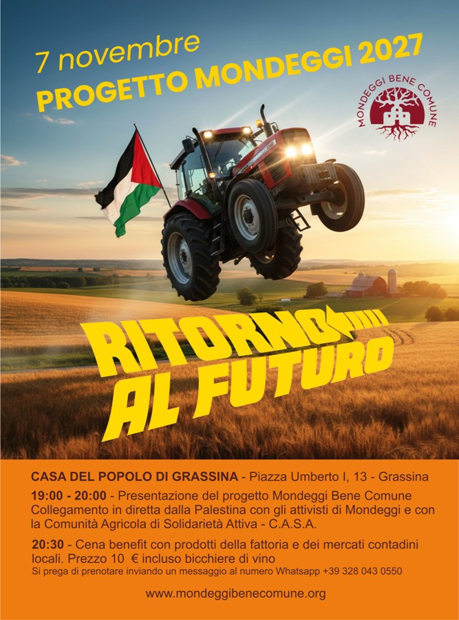 A seguire, “cena benefit”. Durante la serata collegamento con gli attivisti di Mondeggi impegnati in Palestina nella raccolta delle olive, con il progetto C.A.S.A – Comunità Agricola di Supporto all’Agricoltura (Mondeggi per la Palestina: progetto C.A.S.A – MONDEGGI BENE COMUNE).