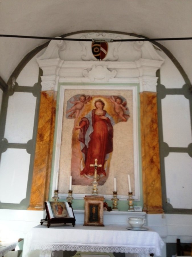 "La cappellina – spiegano le sorelle Buzzoni – è interessante soprattutto per questo affresco che rappresenta Maria. La simbologia rimanda all’iconografia dell’Immacolata Concezione, che pur divenuto dogma solo nel 1854, era venerata dalla devozione popolare da molti secoli, specialmente nell’epoca della Controriforma, quando venne dipinto l’affresco. C’è però un particolare insolito, la Madonna è visibilmente incinta e richiama l’Apocalisse di Giovanni".