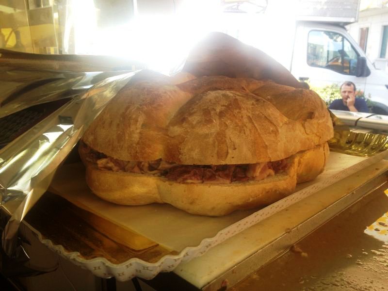 E che panino: la rosetta da sola pesava un kg, mentre il ripieno (composto di lampredotto, sale, pepe, salsa verde, salsa piccante, peperoncino in polvere) pesava addirittura 1,8 kg. Per una panino di quasi tre chili: buona… digestione.