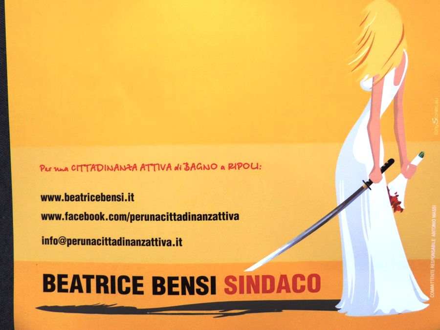 Nel volantino che riassume “Il Comune che vorrei” di Bensi c'è la riproduzione di un disegno del film Kill Bill, la Beatrix di Tarantino con la spada in una mano, i fiori nell'altra, il vestito bianco indosso.