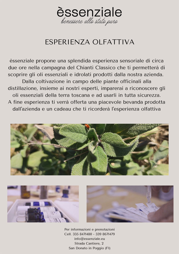 Stavolta andiamo alla scoperta di un’altra vera e propria chicca, che potrete vivere in mezzo alle colline del Chianti Classico grazie ad Essenziale, l’azienda agricola di San Donato in Poggio (Barberino Tavarnelle), rigorosamente biologica, che trasforma le piante, le essenze, in qualcosa di unico: oli essenziali, idrolati, roll on, infusi… .