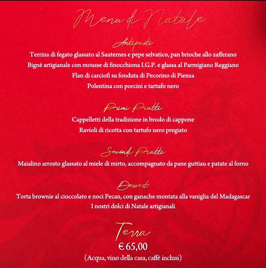 Il menù di terra prevede un ricco antipasto a base di terrina di fegato glassato al Sauternes e pepe selvatico, pan brioche allo zafferano, bignè artigianale con mousse di finocchiona I.G.P. e glassa al Parmigiano Reggiano, flan di carciofi su fonduta di Pecorino di Pienza e polentina con porcini e tartufo nero.