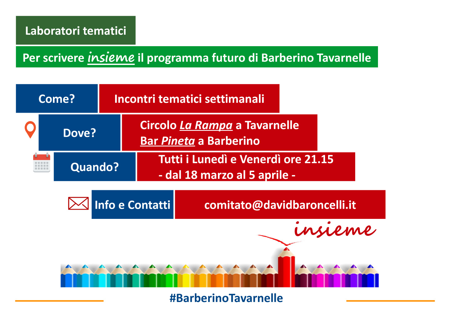 Giacomo Trentanovi, ex sindaco di Barberino Val d'Elsa, è stato presentato come coordinatore della scrittura del programma: "Vedere così tanti ci dà forza e fiducia. Ma perché siamo qua? Perché ci candidiamo e perché David si candida alla guida di questo progetto? Il punto è che questo progetto affonda piedi e radici nella fusione fra i due comuni. Abbiamo fatto un percorso particolare: a fronte di cinque tentativi di fusione in Toscana, siamo stati gli unici a farcela. Perché fino dal primo giorno della passata legislatura, ma anche delle precedenti, c’è stato questo obbiettivo. Fatto di piccoli passi, uno dietro l’altro. Un pezzettino alla volta. E questo vogliamo farlo anche per il futuro".