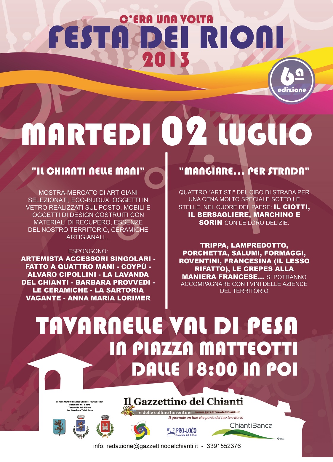 TAVARNELLE – "C’era una volta Festa dei Rioni", il tradizionale palio rionale che fino a domenica 7 scalderà piazze e vie di Tavarnelle, propone per oggi, martedì 2 luglio dalle 18 in poi, un evento speciale in piazza Matteotti arricchita dall’originalità di produzioni artigianali locali e dai profumi dei cibi di strada legati alla trazione toscana.