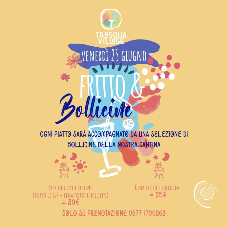 Venerdì sarà invece la volta di Fritto & Bollicine, un’occasione davvero golosa per mangiare specialità (come verdure e il tuorlo d’uovo) fritte, accompagnate da una selezione di bollicine della cantina di Trasqua e l’accompagnamento di musica jazz, latin jazz e blues.