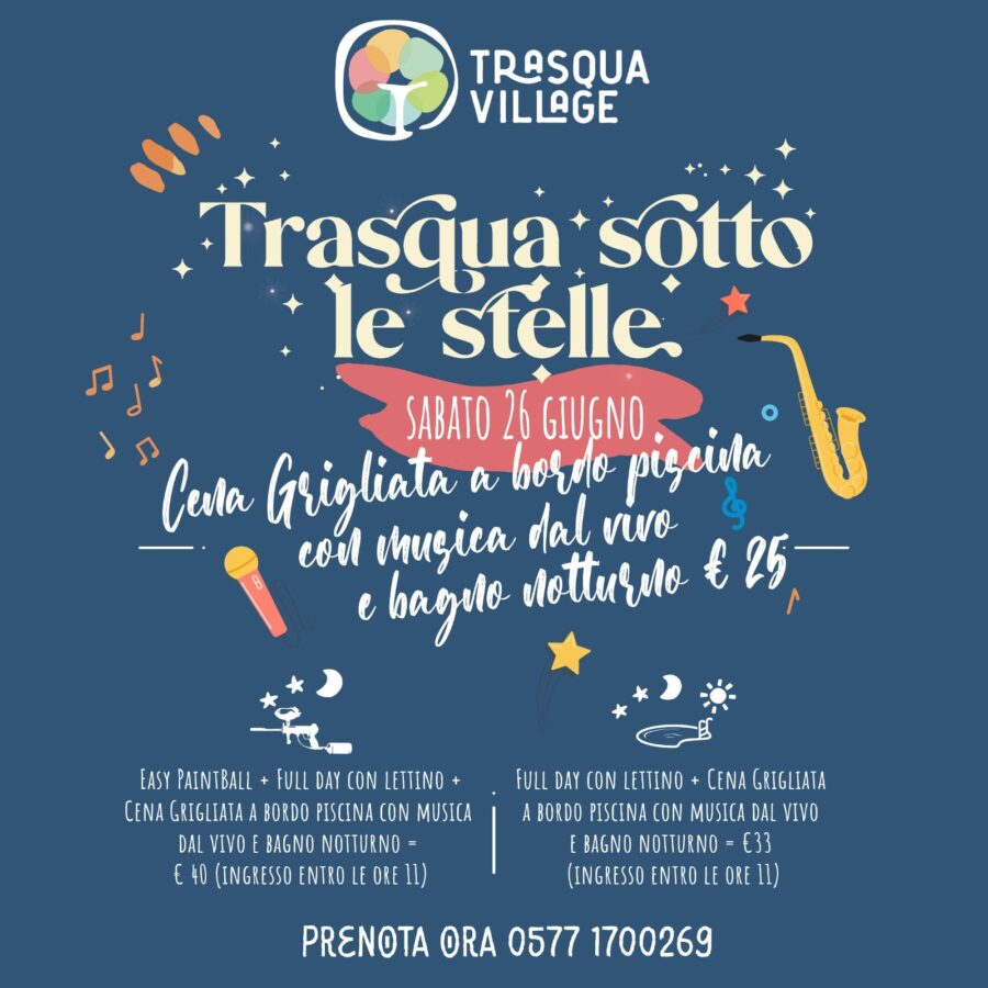 Sabato e domenica il fine settimana si scalda con Trasqua sotto le stelle. Anche in questo caso cena a bordo piscina con grigliata di carni selezionate di Trasqua, live music e bagno notturno.