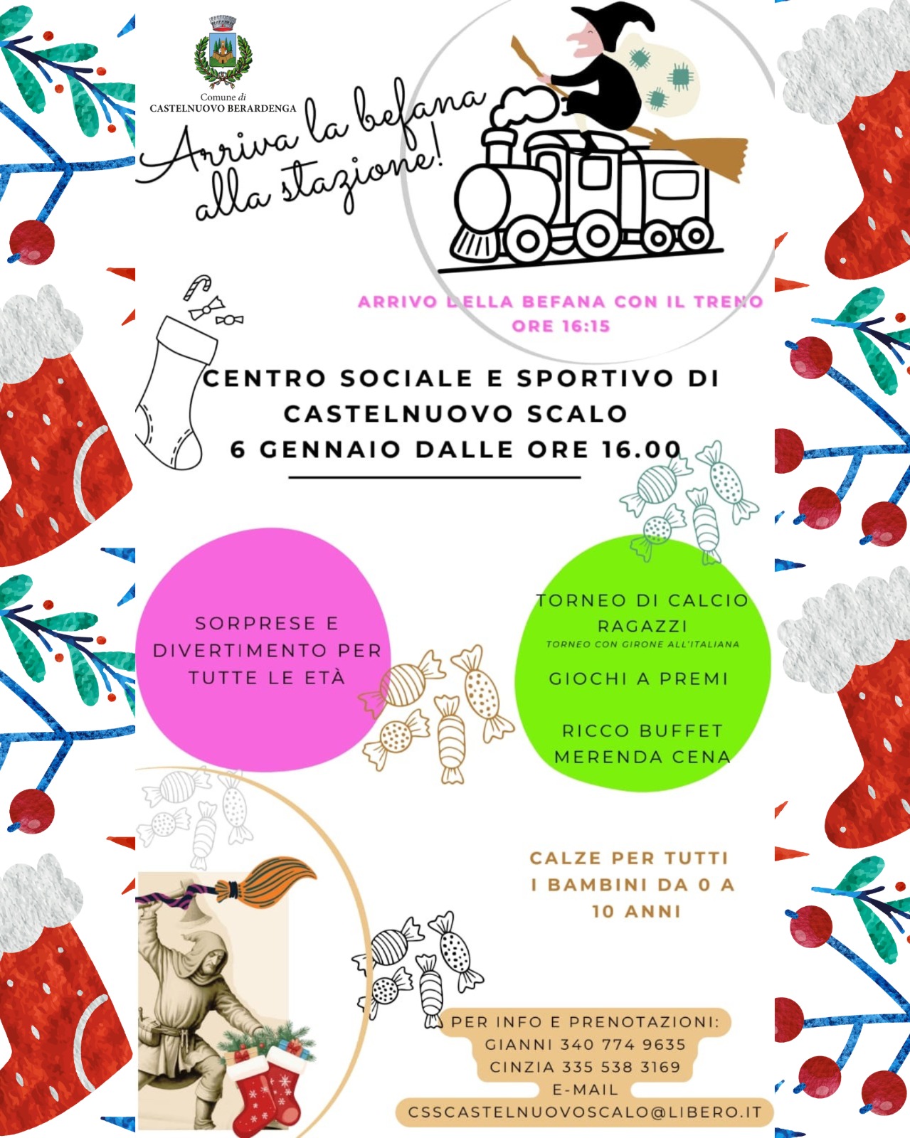 CASTELNUOVO BERARDENGA – “Arriva la Befana alla stazione!”: martedì 6 gennaio appuntamento al Centro Sociale e Sportivo di Castelnuovo Scalo per un pomeriggio di festa, giochi e sorprese per grandi e piccini.