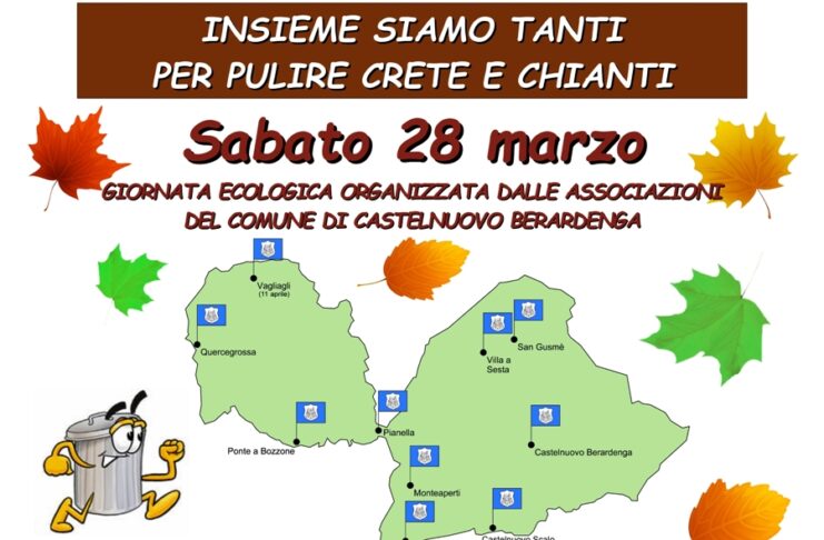 Sabato 28 marzo, a partire dalle ore 8.30, il Comune di Castelnuovo Berardenga promuove la Giornata Ecologica “Insieme siamo tanti per pulire Crete e Chianti”, iniziativa organizzata dalle associazioni del territorio con il coordinamento della Consulta Comunale dell’Associazionismo e del Volontariato.