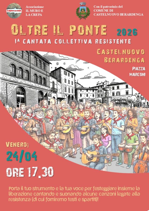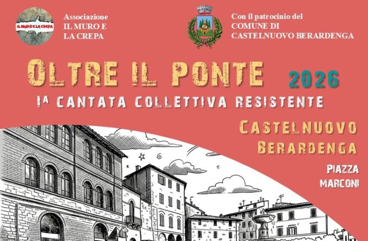 CASTELNUOVO BERARDENGA – Si svolgerà oggi, venerdì 24 aprile, vigilia della festa della Liberazione, un’iniziativa organizzata dall’associazione Il Muro e La Crepa e patrocinata dal Comune di Castelnuovo Berardenga: “Oltre il Ponte – Prima Cantata collettiva resistente”.