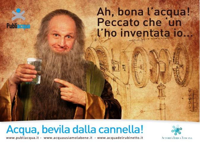 Dante Alighieri e Leonardo da Vinci, dopo la campagna per il risparmio durante la più lunga siccità del secolo (“Chi spreca l’acqua lo metto all’Inferno”; “Io pitturo a olio. L’acqua la bevo, ‘un la spreco per la Gioconda!”) tornano a promuovere l’acqua pubblica e sottolineano, grazie all’interpretazione e alle battute dell’attore testimonial Paolo Hendel, la qualità eccellente dell’acqua del rubinetto e dei fontanelli, le sue virtù di risorsa importante per il rispetto dell’ambiente e il risparmio economico in un territorio dove una famiglia media spende più per le acque imbottigliate che per la bolletta idrica (circa 300 euro l'anno in media contro 240). Il top europeo!