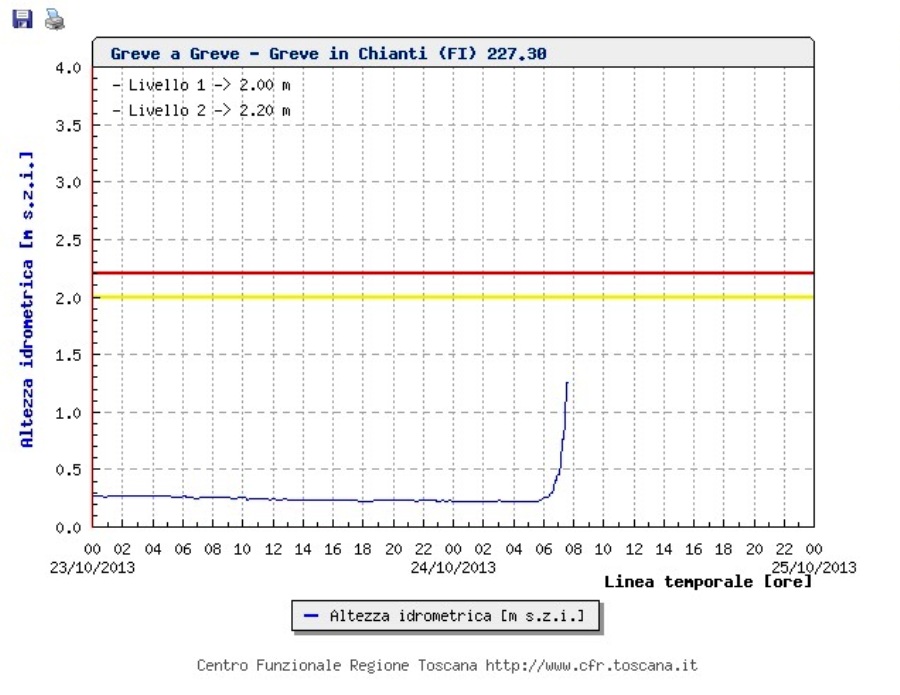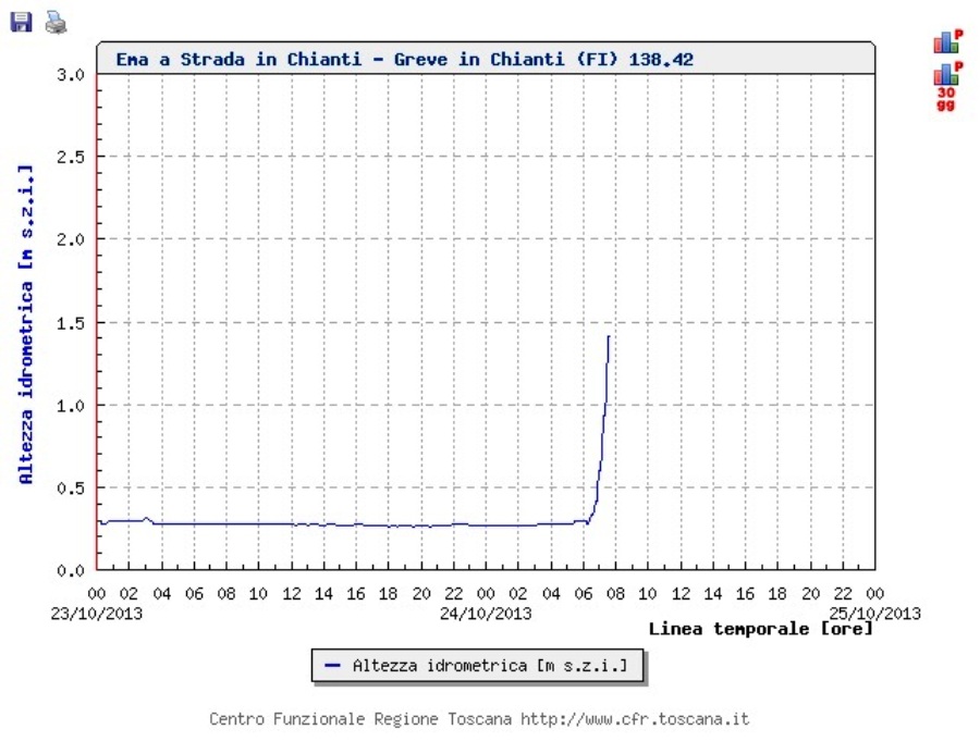 Piogge abbondanti anche nelle vallate della Pesa, della Greve e dell’Ema. L’Ema a Strada in Chianti è cresciuta di quasi 1 metro e mezzo in poco più di un’ora e sempre tra le 6 e le 7.30 la Greve a Greve in Chianti è salita di 1 metro, pur rimanendo sotto il primo livello di guardia fissato ad un altezza di 2 metri e la Pesa a Turbone è salita di quasi 2 metri attestandosi intorno ai 3 metri, abbondantemente sotto di un metro dai livelli di guardia.
