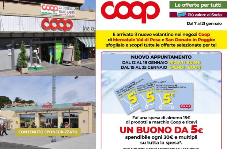CHIANTI FIORENTINO – Ecco, qui sotto, il volantino con le offerte che potrete trovare presso i negozi Coop di Mercatale e San Donato in Poggio, dal 7 al 21 gennaio.