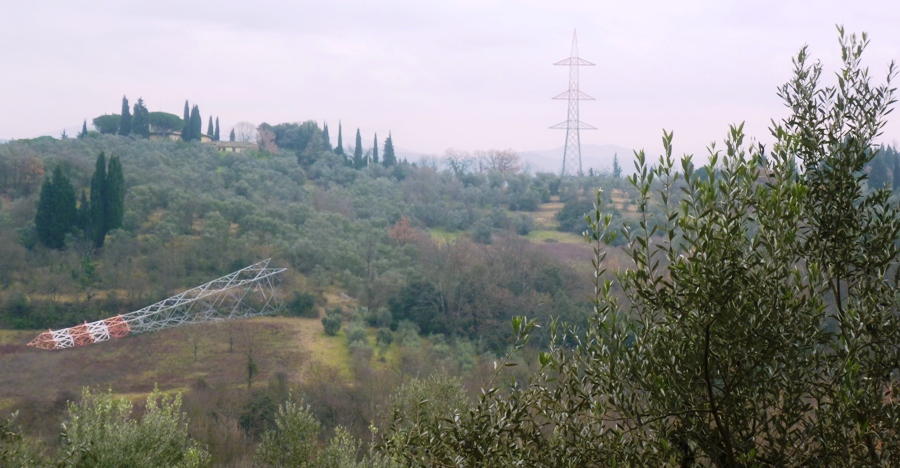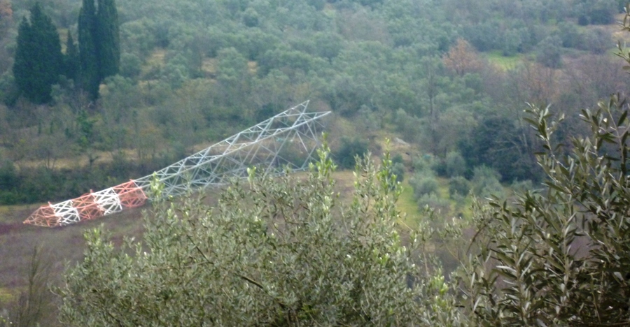 CHIANTI FIORENTINO – Fa un certo effetto, per chi si trova a transitare lungo via Volterrana, nella zona di Giogoli (per essere più chiari all'altezza del ristorante "Bella Ciao"): se si getta l'occhio sulle colline che guardano verso l'Impruneta infatti, ecoc che si nota un enorme traliccio adagiato su un fianco (vedi foto sopra).