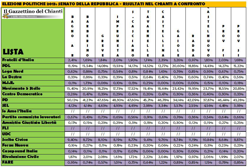 Nella foto qui sopra (CLICCA SULL'ICONA PICCOLA PER INGRANDIRLA), la tabella elaborata dal Gazzettino con tutti i dati finali al Senato della Repubblica nei dieci comuni del Chianti fiorentino, senese e delle colline fiorentine. Inoltre, nelle ultime due colonne trovate anche i totali delle province di Firenze e di Siena.