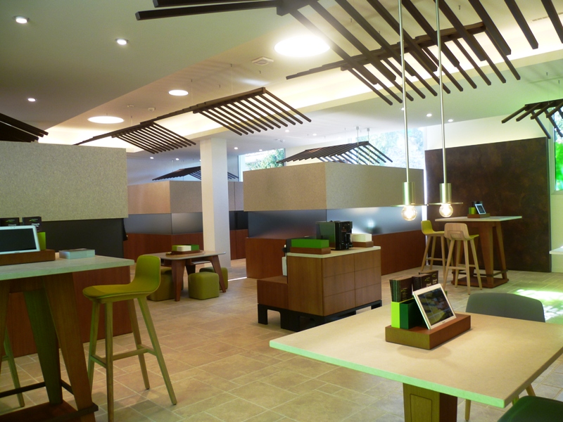 L’impiego di materiali naturali, leggeri e sostenibili accentua il tono cordiale ed elimina la sensazione di burocrazia che spesso caratterizza gli ambienti bancari. L'approccio relazionale subisce quindi una profonda trasformazione, grazie all'introduzione di differenti luoghi in cui avviene la consulenza: tavolini bassi con sedute, tavoli alti con sgabelli e zone più chiuse per una maggior privacy.