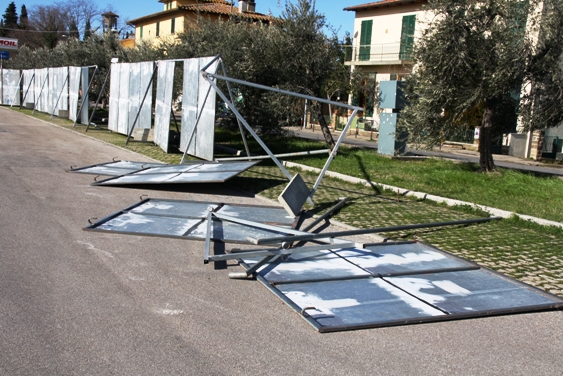 A Montagnana altro episodio: una parte dei pannelli istallati per la propaganda elettorale lungo il parcheggio, è crollato a terra sempre a causa del forte vento. Il caso ha voluto che nessuna auto fosse parcheggiata su quel lato.