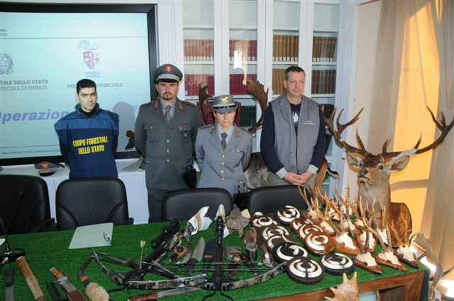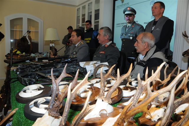 Poste sotto sequestro 45 armi tra cui fucili e carabine; 600 munizioni di vari calibri; 200 kg circa di carne surgelata di fauna selvatica in parte già confezionata e pronta per essere venduta; 95 trofei sia completi che parti di trofeo; 8 esemplari sottoposti a normativa C.I.T.E.S..