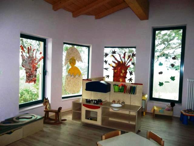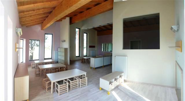 Gli spazi interni sono stati pensati, progettati e costruiti per accogliere al meglio i bambini: i soffitti e i pavimenti sono in legno, le pareti sono state tinteggiate con tinte calde e colorare, la disposizione e la tipologia delle aperture, con ampie vetrate, sono state ideate per garantire il passaggio della luce dando la sensazione di essere quasi all’aperto.