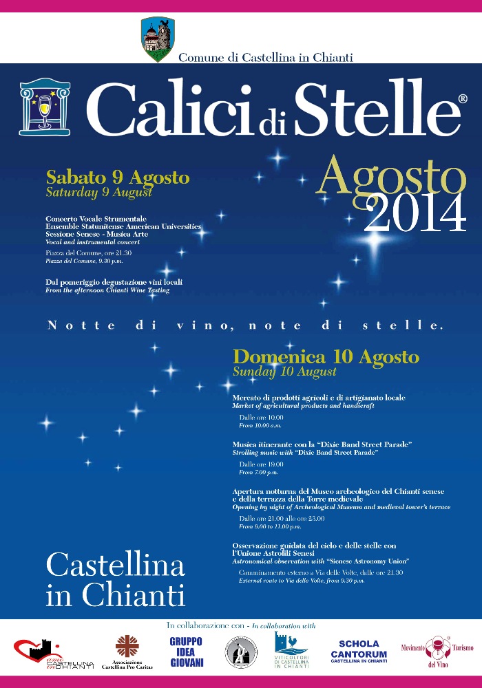 CASTELLINA IN CHIANTI – “Calici di Stelle” raddoppia a Castellina in Chianti. Per due giorni, sabato 9 e domenica 10 agosto, le vie del borgo chiantigiano saranno animate dall’edizione 2014 della manifestazione – promossa in tutta Italia dall’Associazione nazionale Città del Vino, dal Movimento del turismo del vino e dall’Unione Astrofili italiani – con degustazione di vini e street food, musica, l’apertura notturna del Museo archeologico del Chianti senese e della terrazza della Torre medievale, il mercato di prodotti agricoli e artigianato locale e il tradizionale appuntamento con l’osservazione guidata delle stelle.