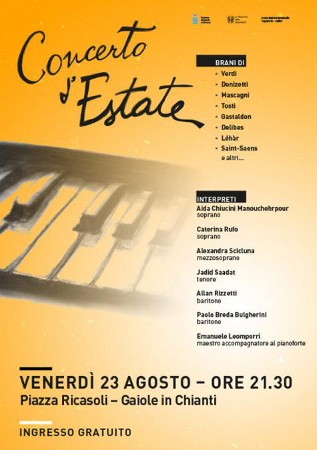 GAIOLE IN CHIANTI – Dai grandi della musica lirica alle canzoni popolari. E’ “Concerto lirico d’Estate” in programma venerdì 23 agosto, alle 21.30, in piazza Ricasoli a Gaiole in Chianti che vedrà esibirsi l’Associazione Musicale Opera in Celle in brani di, tra gli altri, Wolfgang Amadeus Mozart; Giacomo Puccini; Gioachino Rossini; Francesco Paolo Tosti; Franz Lehár; Luigi Arditi; Eduardo Di Capua; Ernesto De Curtis ed Enzo Fusco.