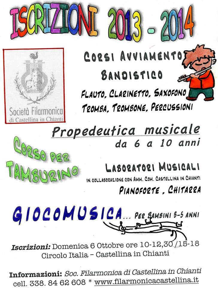 CASTELLINA IN CHIANTI – La Società Filarmonica di Castellna in Chianti organizza corsi di avviamento bandistico: Flauto, Clarinetto, Saxofono, Tromba, Trombone, Percussioni, Propedeutica musicale da 6 a 10 anni, Laboratori Musicali. In collaborazione con l'amministrazione comunale di Castellina in Chianti Pianoforte, Chitarra, Giocomusica per bambini 3-5 anni.