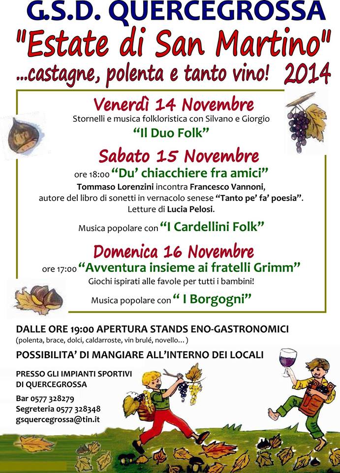 QUERCEGROSSA (CASTELNUOVO BERARDENGA) – Da venerdì 14 a domenica 16 novembre Quercegrossa festeggia l’"Estate di San Martino" con tre giorni di animazione, musica popolare, castagne, polenta e vino, in omaggio al periodo autunnale in cui, dopo le prime gelate, si verificano condizioni climatiche più miti.