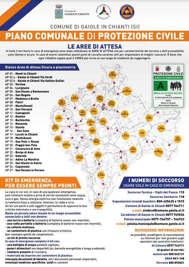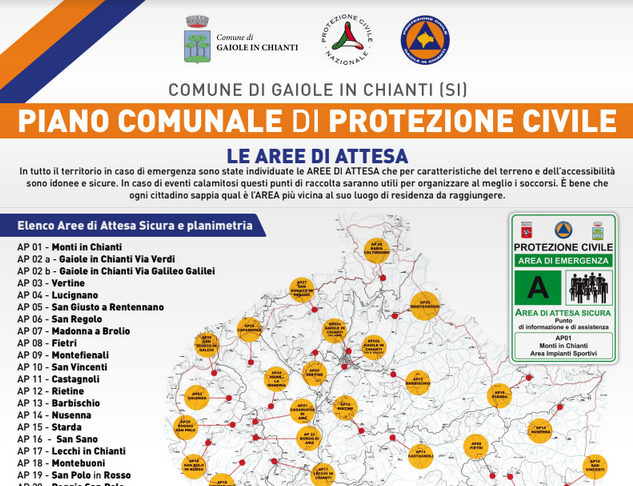 Il Piano comunale di protezione civile suddivide il territorio comunale di Gaiole in Chianti in aree di attesa, ovvero in piccoli nuclei di raccolta della popolazione, tutti mappati e individuati sulla base delle caratteristiche  geomorfologiche (tipo di terreno, facile accessibilità, sicurezza).