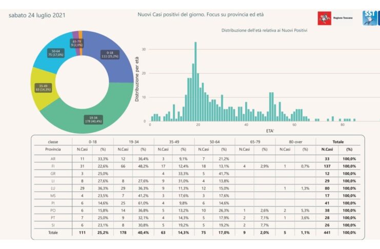 “I nuovi casi registrati in Toscana – dice il presidente della Regione, Eugenio Giani – sono 441 su 13.954 test”.