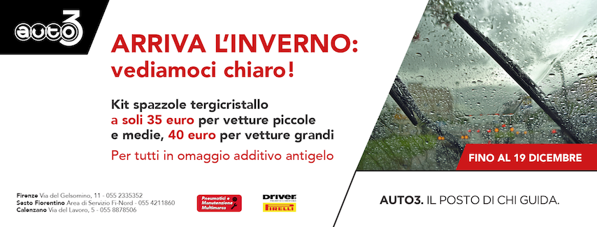 FIRENZE – Fino al 19 dicembre da Auto3 kit spazzole a prezzo scontato e liquido antigelo in omaggio.