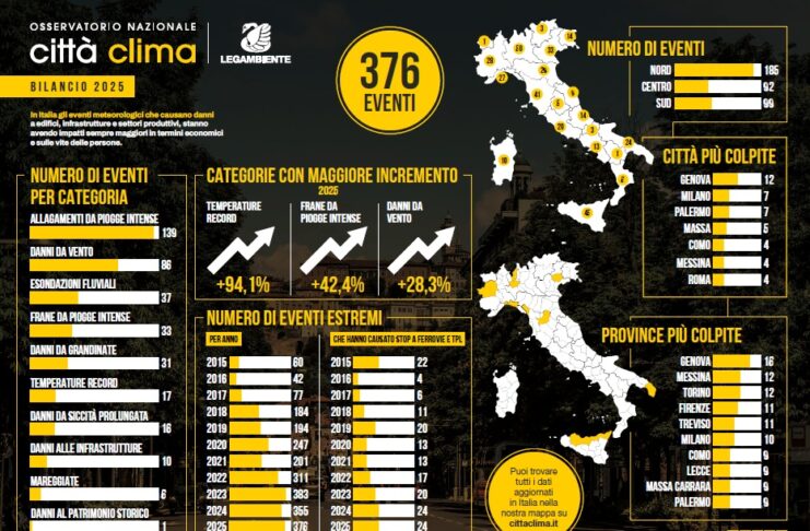 A scattare questa fotografia di fine anno è l’Osservatorio Città Clima di Legambiente, realizzato in collaborazione con il Gruppo Unipol, che mette in fila i numeri della crisi climatica in Italia nel 2025, per quanto riguarda fenomeni come allagamenti da piogge intense, danni da vento, esondazioni fluviali, frane ma anche temperature record, siccità e danni alle infrastrutture.