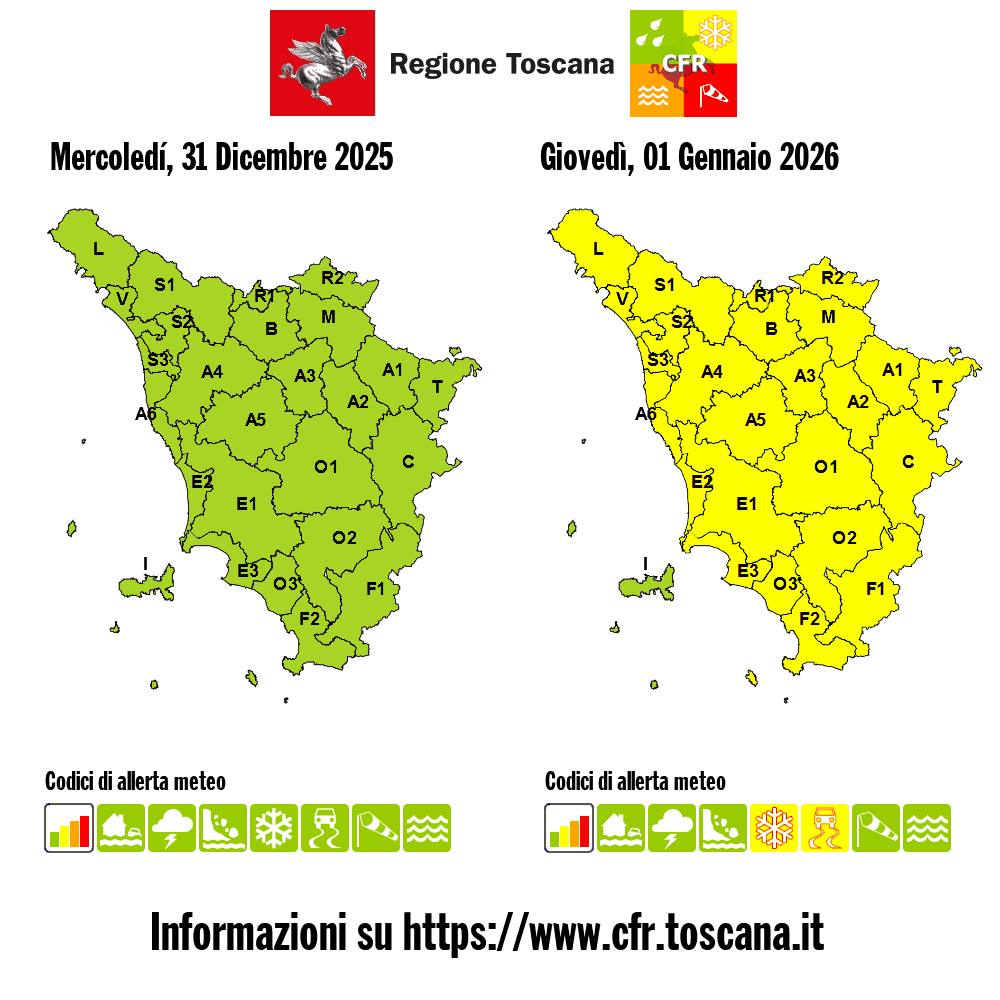 Dalla mezzanotte fino alle 12 di domani, giovedì 1, codice giallo invece per rischio ghiaccio su tutto il territorio regionale, ad esclusione delle isole dell’Arcipelago.