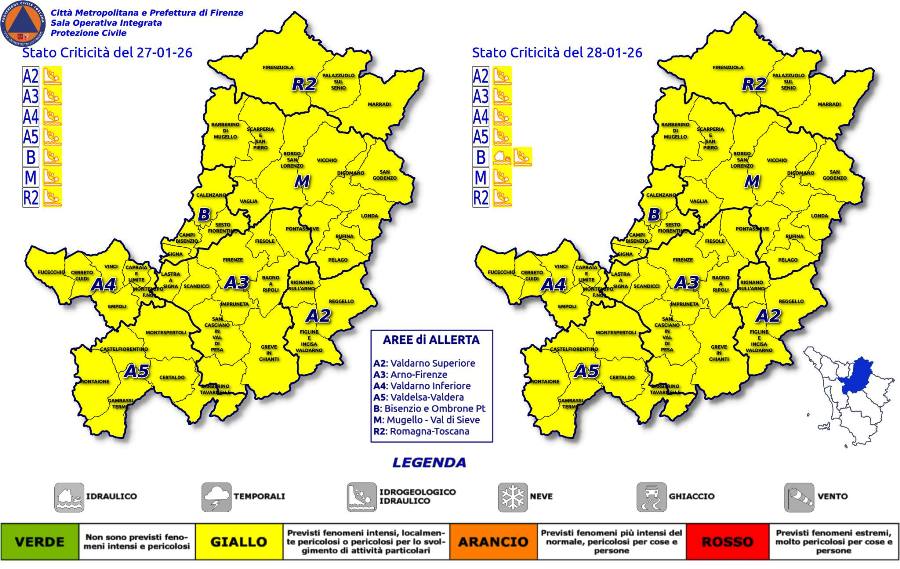 La Sala operativa della Protezione civile regionale ha emesso un’allerta meteo con codice giallo per rischio idrogeologico e idraulico del reticolo minore che dalla ore 22 di stasera e per tutta la giornata di domani, mercoledì 28 gennaio, riguarderà l’intera Toscana.