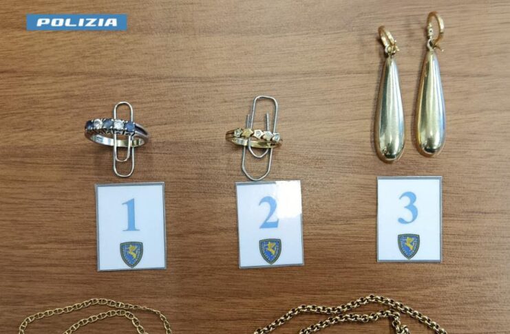 Il bottino recuperato dai poliziotti, nella foto, era di una collana lunga circa 40 cm, una di circa 35 cm due orecchini e due anelli.