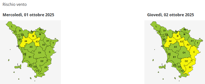 TOSCANA – Il codice giallo per il vento forte causato dall’arrivo di un nucleo di aria fredda da est, associato a condizioni di moderata instabilità, è stato esteso fino alle ore 20 di domani, giovedì 2 ottobre.