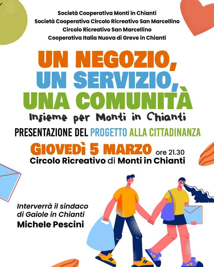 L’iniziativa è promossa da: cooperativa Italia Nuova di Greve in Chianti, società cooperativa Monti in Chianti, Circolo ricreativo San Marcellino e società cooperativa Circolo Ricreativo San Marcellino, per presentare un progetto sui servizi di prossimità.