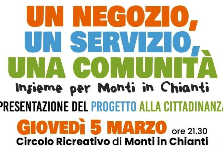 MONTI (GAIOLE IN CHIANTI) – “Un negozio, un servizio, una comunità. Insieme per Monti in Chianti” è il titolo dell’incontro pubblico in programma giovedì 5 marzo, alle ore 21.30, al Circolo Ricreativo di Monti in Chianti.