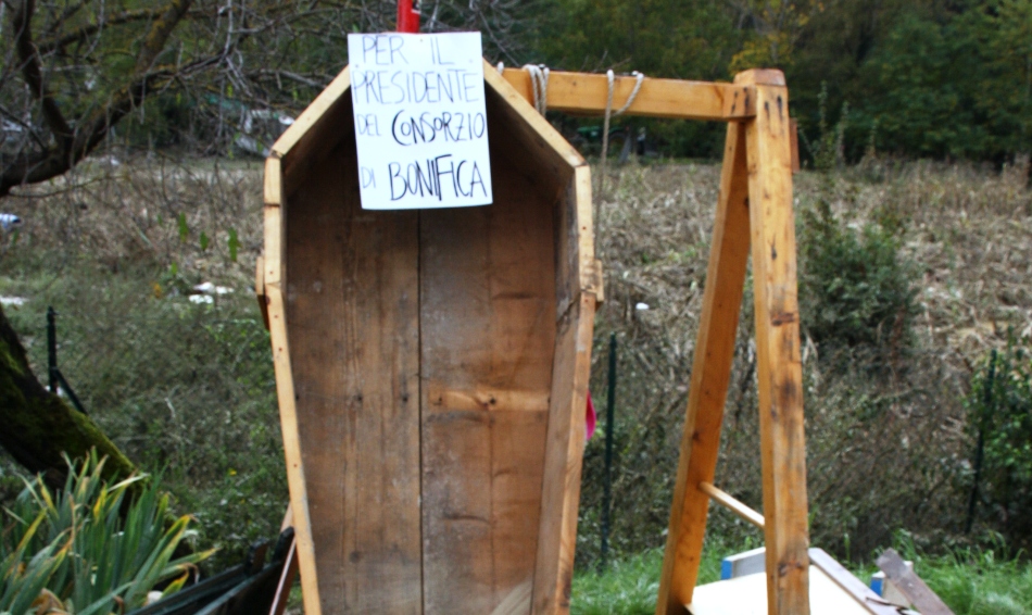 A pochi passi materiale vario da buttare, e fra questa roba spunta perfino una cassa da morto con la scritta “Per il Presidente del Consorzio di Bonifica” (autorizzato ai debiti scongiuri).