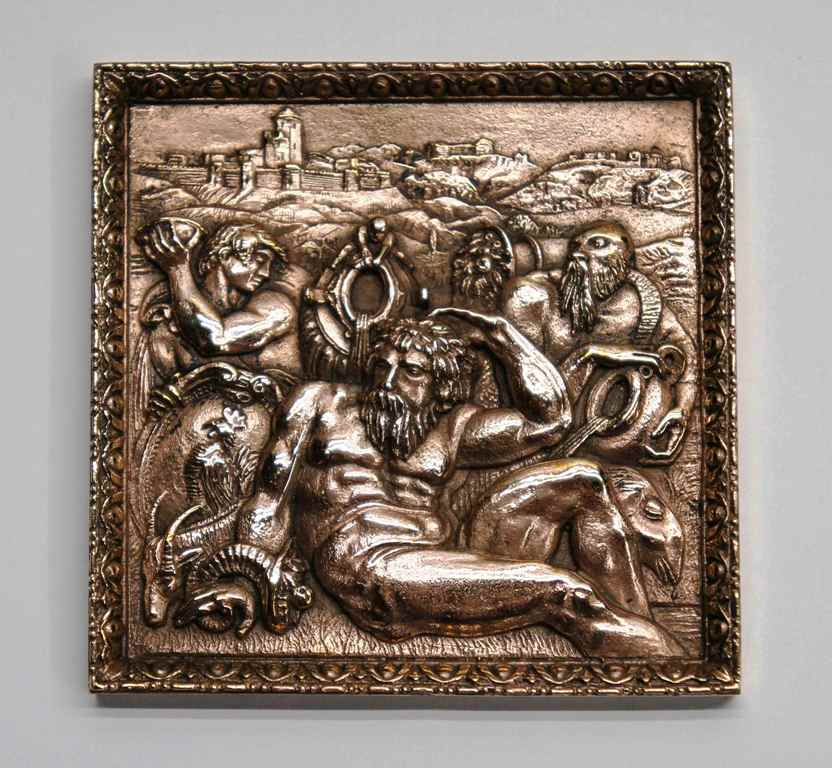 Si tratta di un bassorilievo in bronzo raffigurante il quadro di Giorgio Vasari “Allegoria del Chianti” (1563-1565) realizzata dal maestro orafo grevigiano Mauro Bandinelli.