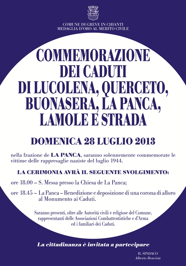 GREVE IN CHIANTI – Commemorazione dei caduti di Lucolena, Querceto, La Panca, Lamole e Strada in Chianti: domenica 28 luglio nella frazione de La Panca saranno solennemente commemorate le vittime delle rappresaglie naziste del luglio 1944.