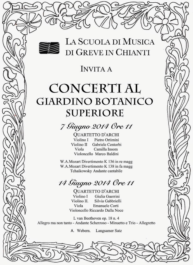 Oppure potete approfittare sabato 14 giugno sempre alle 11 e partecipare al secondo concerto del Quartetto d'Archi della Scuola di Musica di Greve in Chianti.