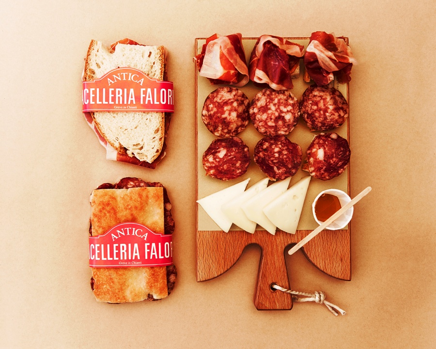 "Il menù – entrano dei dettagli… mangerecci – è quello tipico del Chianti, rustico ma rivisitato in chiave contemporanea, ideato per soddisfare le esigenze di chi ha voglia di un pranzo veloce ed informale, ma anche per una merenda saporita o un aperitivo alternativo. Protagonisti sono i salumi che hanno reso celebre l’Antica Macelleria Falorni: il salame con toro, la salsiccia stagionata con cinghiale e la finocchiata di Montefioralle, che compongono il “tagliere di Stefano”; il salame tipico grevigiano, il prosciutto saporito e la finocchiona sbriciolona, presentati in quello “di Lorenzo”: entrambi accompagnati da una selezione di pecorini, marmellata e miele".
